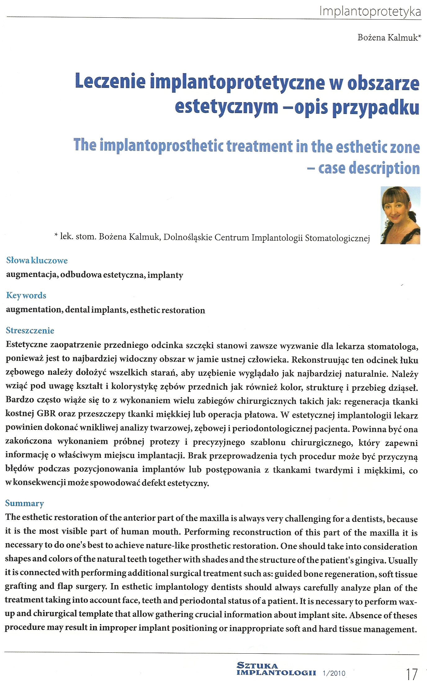 Lecznie implantoprotetyczne w obszarze estetycznym – opis przypadku – dr Bożena Kalmuk
